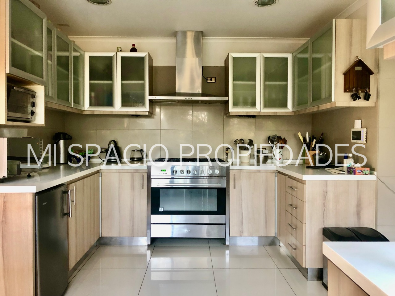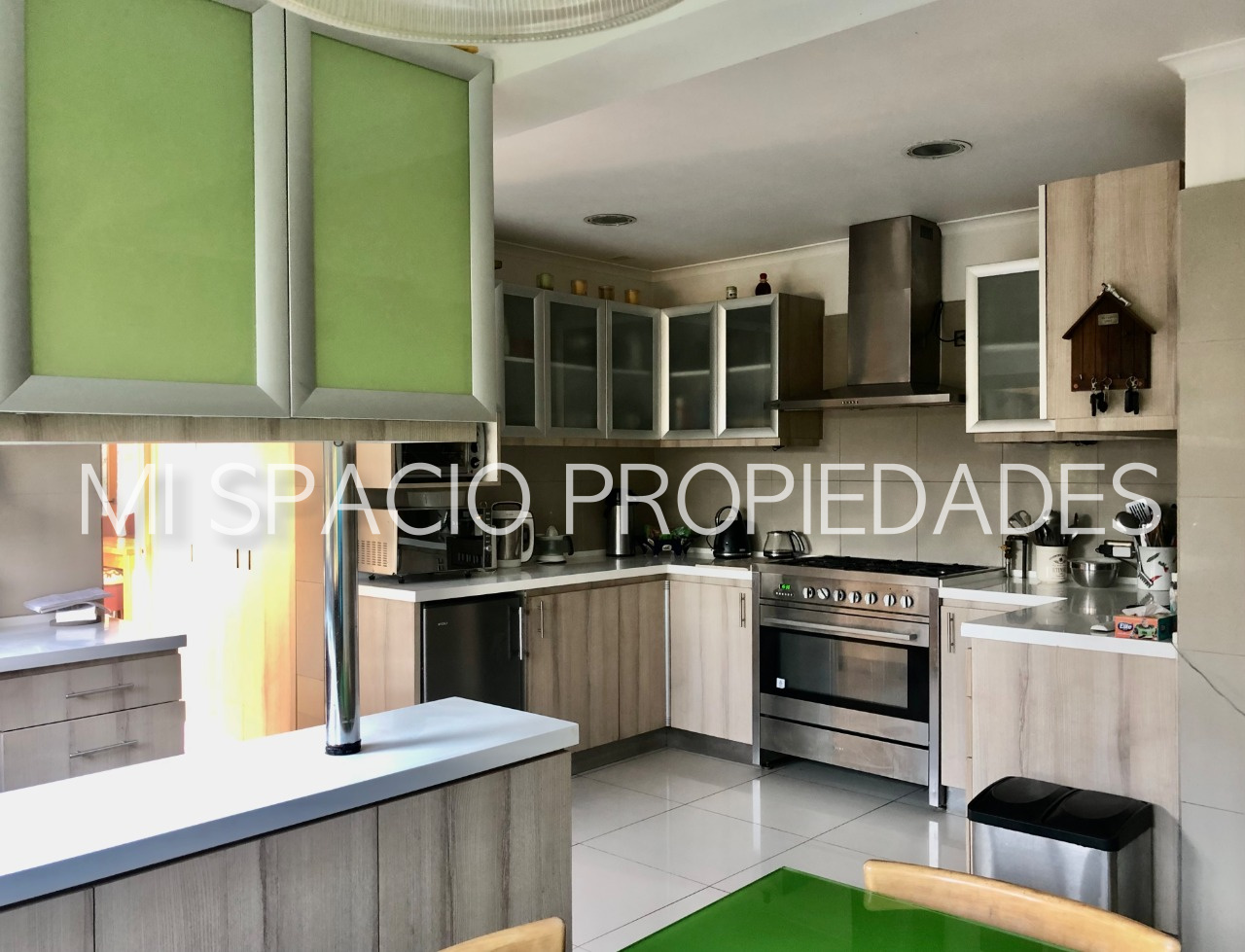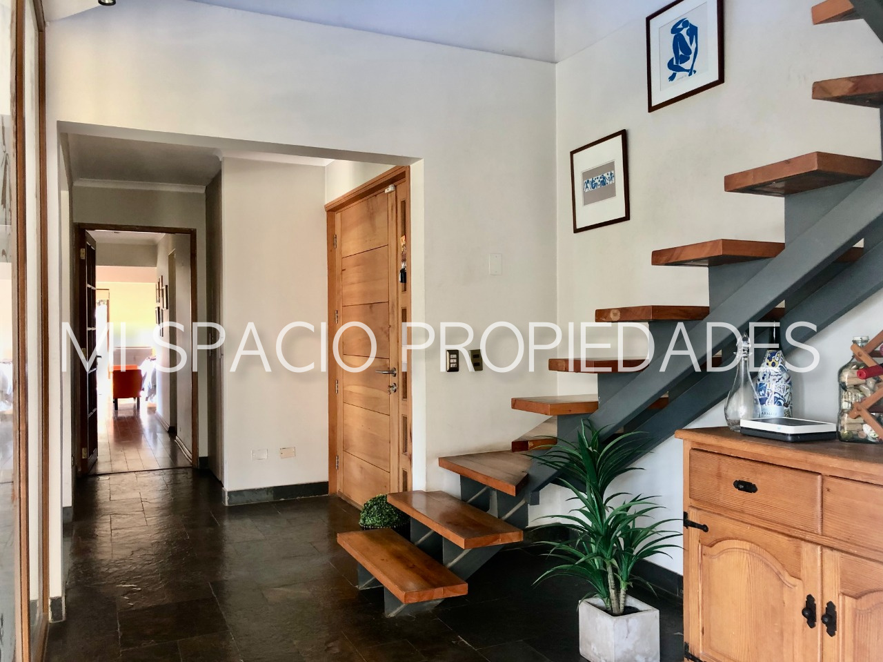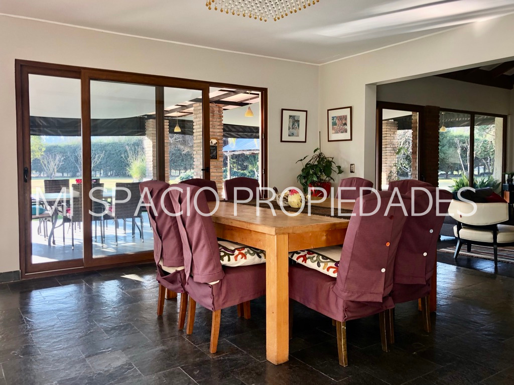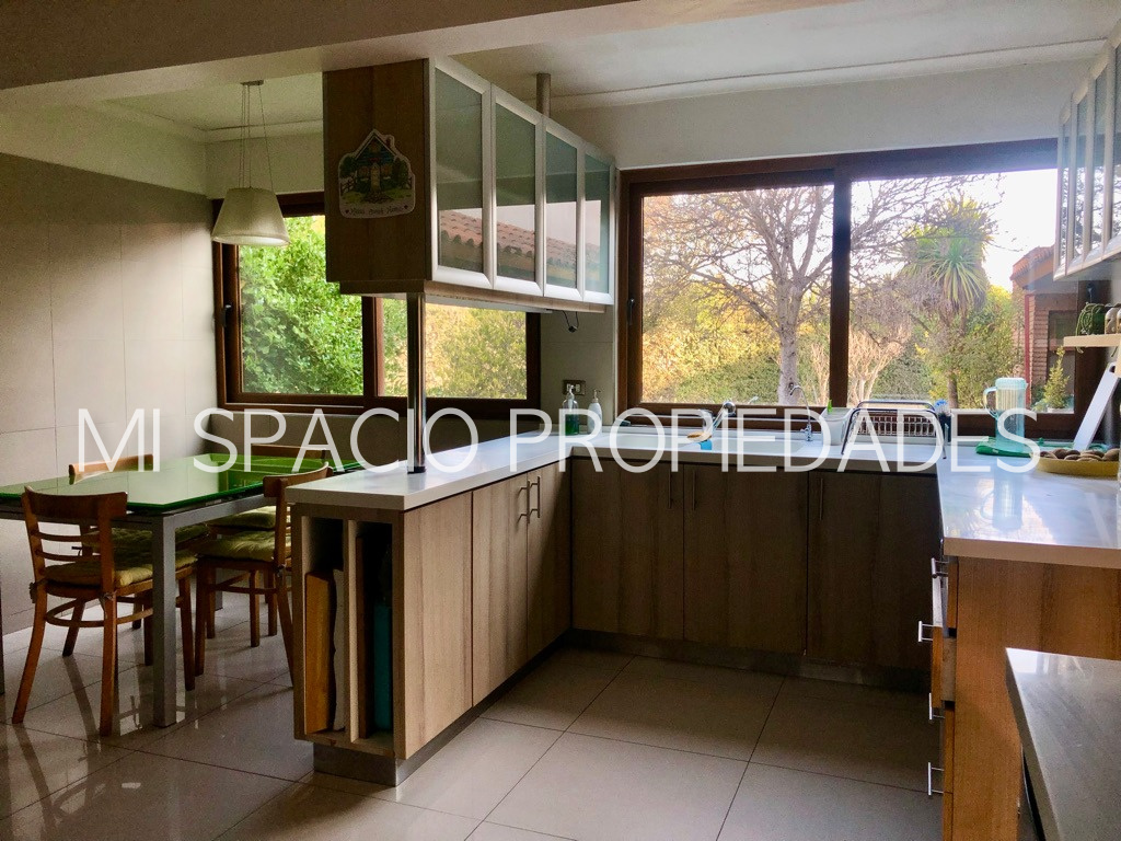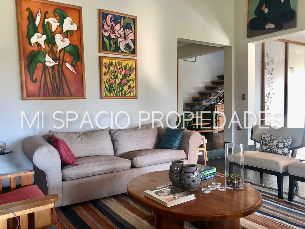1er piso: Hall de acceso con hermoso muro exterior curvo de enchape de ladrillo y pisos en piedra pizarra que accede a living de doble altura y vigas a la vista, comedor separador con bow Windows y ventanales de corredera que acceden a amplia terraza techada ideal para uso en toda temporada. Cocina amoblada y equipada con campana y hermosas cubiertas, pisos en porcelanatos, espacio para comedor de diario, dormitorio y baño de servicio, amplio lavadero cubierto que accede a estacionamientos cubiertos para 3 autos y bodega. Baño de visita con precioso vanitorio, 3 amplios dormitorios con closet, baño con doble vanitorio y ducha en obra. Dormitorio principal en suite, walk in closet, sala de baño con acceso a patio privado. 2do piso amplio estar o dormitorio con preciosa vista al jardín.