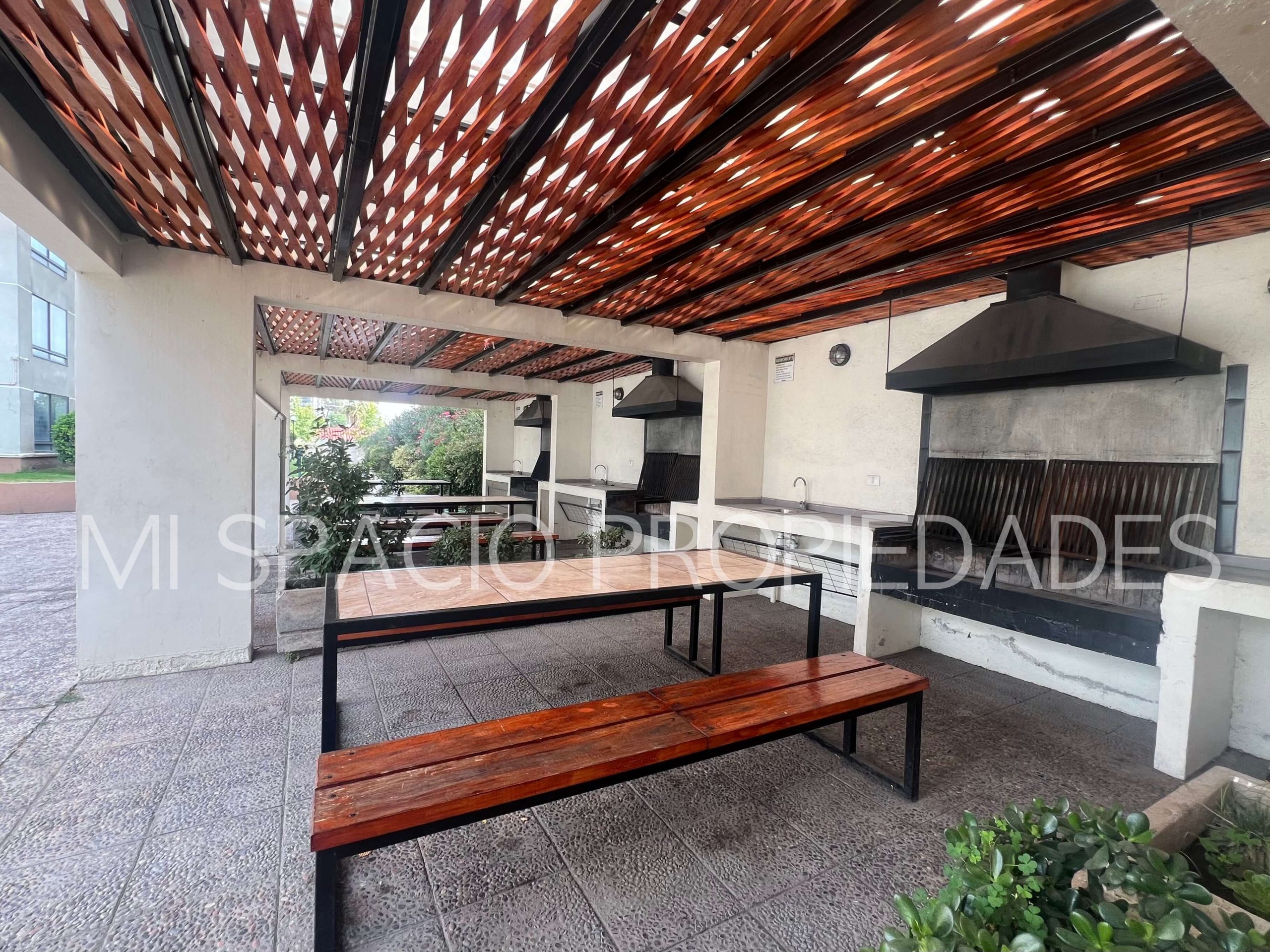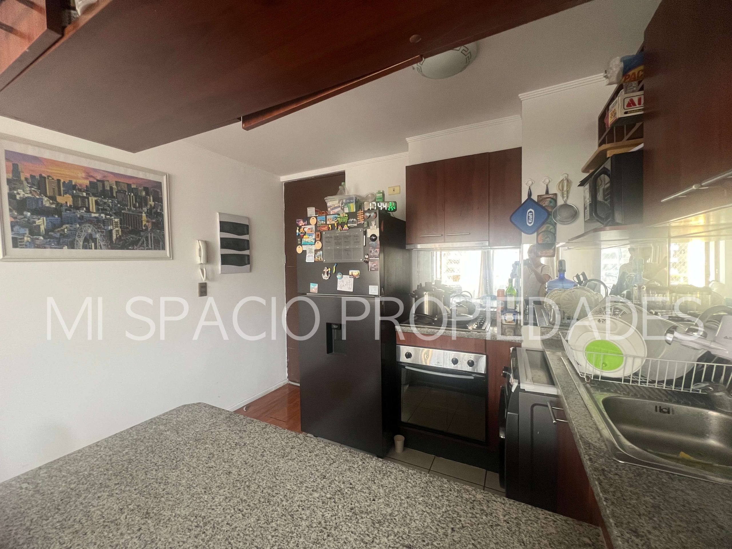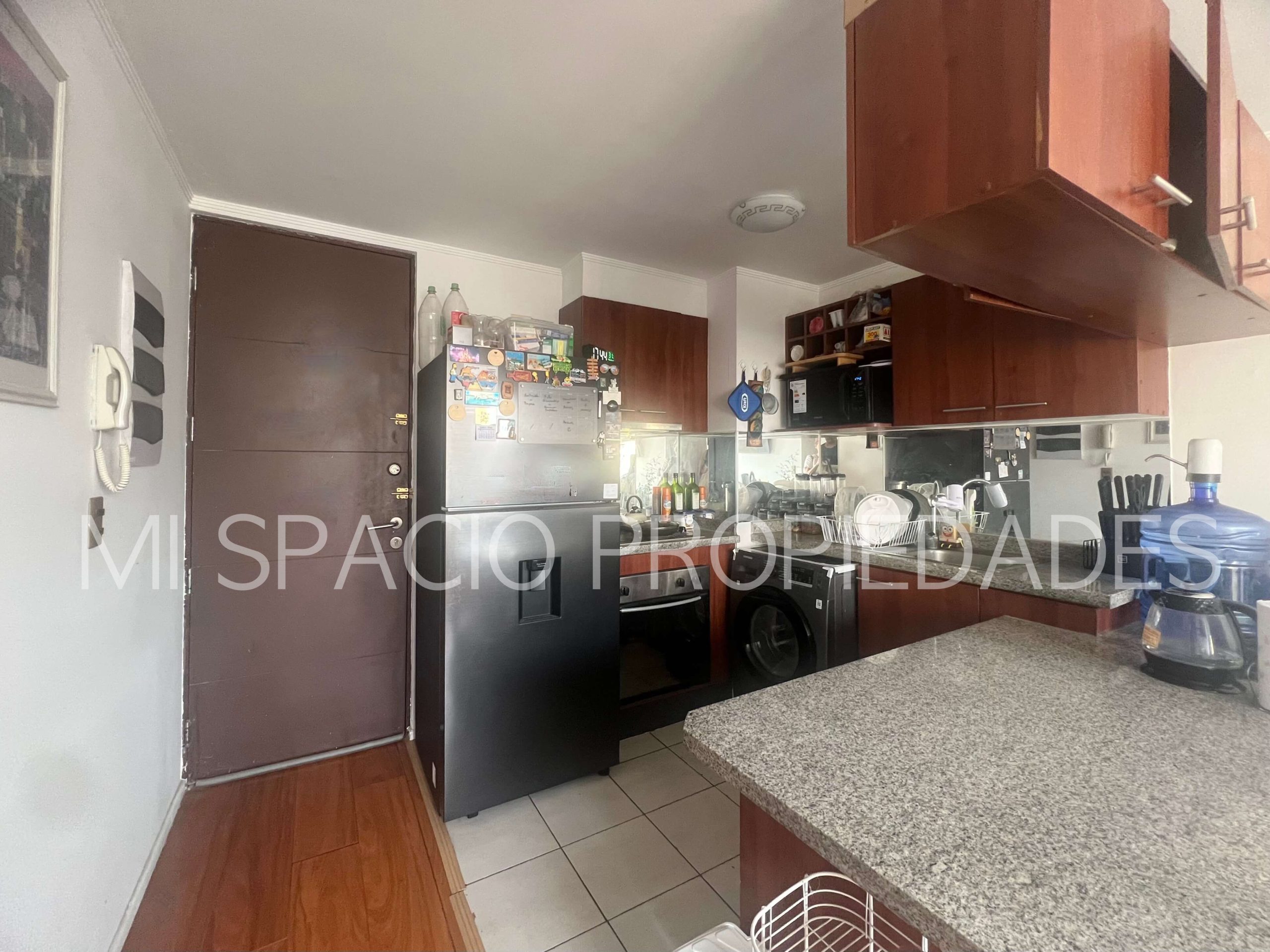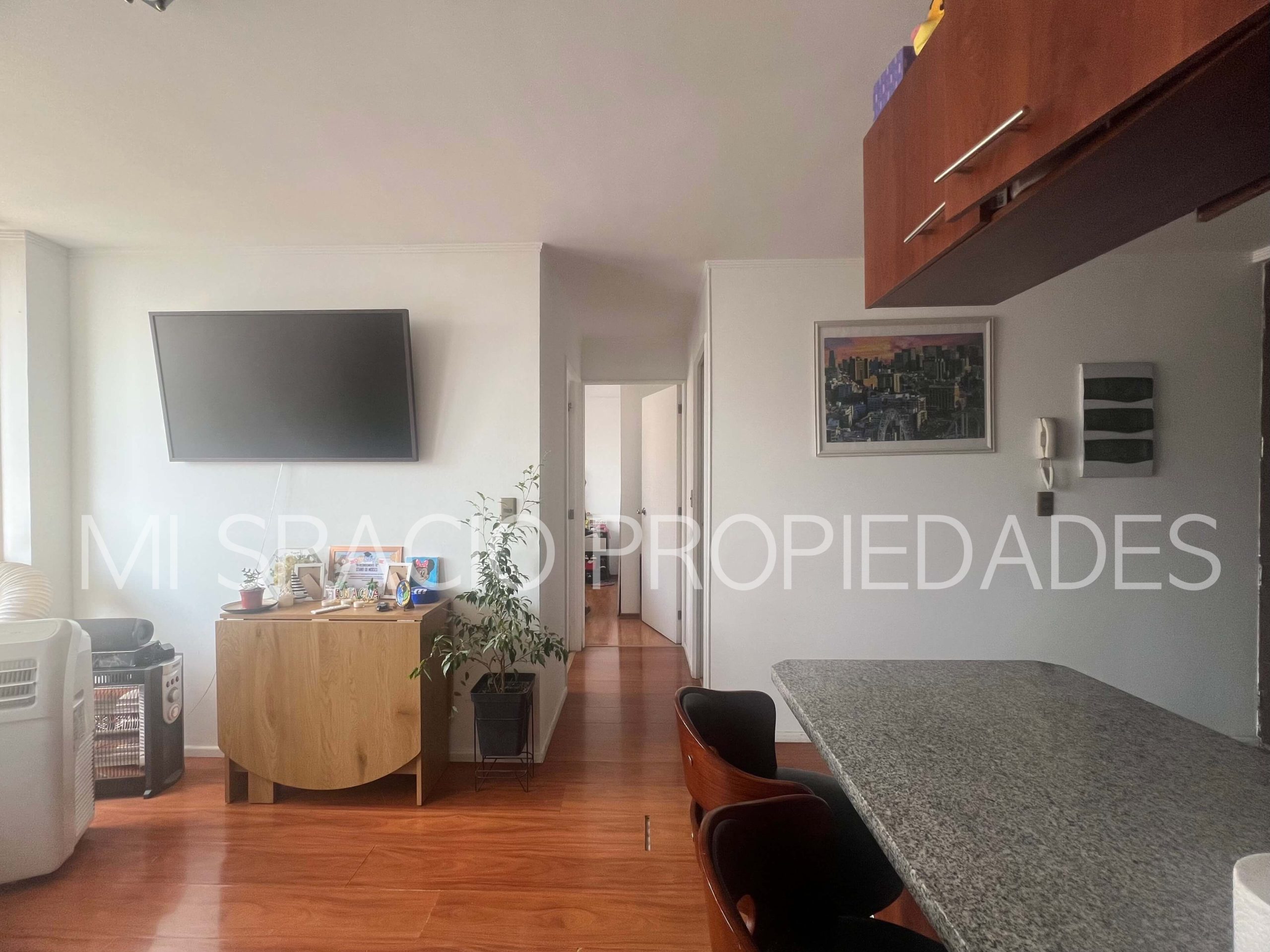 Cocina americana amoblada y equipada: encimera eléctrica, horno eléctrico empotrado y campana, conexión para lavadora de platos o de ropa. 1 dormitorio con closet para cama de 1 plaza, o escritorio, 2do dormitorio principal con closet, 1 baño completo con tina. Balcón en living, estacionamiento en superficie, sin bodega. Edificio Don Vicente cuenta con 2 torres, con 3 ascensores en cada una, 14 unidades por piso, 23 pisos totales, conserjería, acceso controlado 24 x 7, áreas comunes compuesta por piscina, áreas verdes, juegos infantiles, quinchos, sala de lavandería y secado, estacionamiento para visitas.